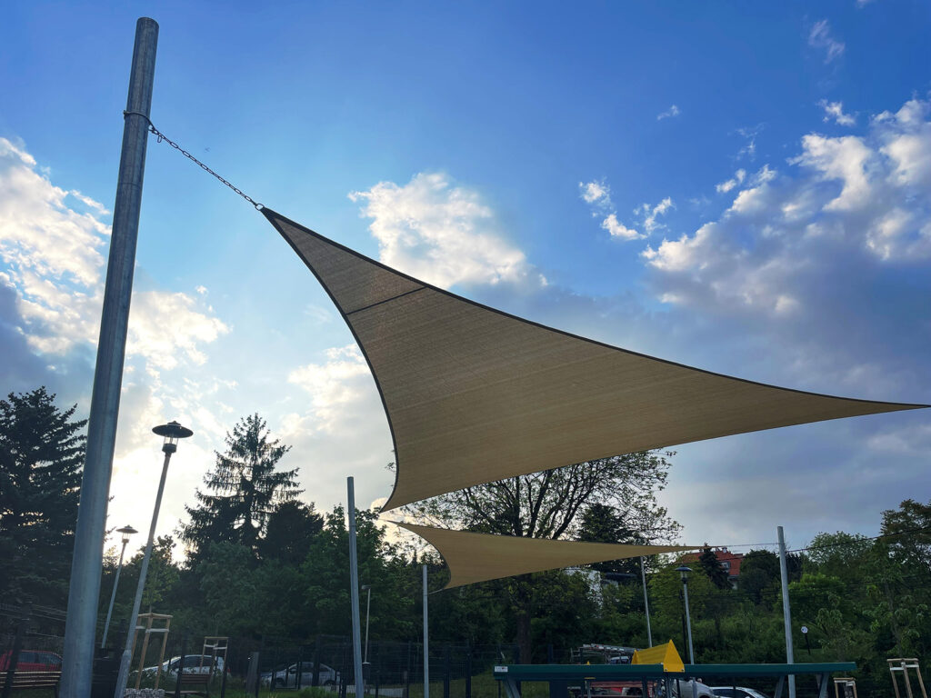 A háromszög alakú napvitorla praktikus és esztétikus árnyékolási megoldás kültéri rendezvényekhez. Modern formavilágának köszönhetően nemcsak hatékony védelmet nyújt a napsugárzás ellen, hanem vizuálisan is feldobja a rendezvénytér megjelenését.